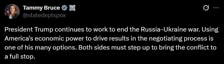 "Президент Трамп продовжує працювати над припиненням російсько-української війни. Використання економічної могутності Америки для досягнення результатів у переговорному процесі - один із його численних варіантів. Обидві сторони мають активізувати зусилля, щоб повністю покласти край конфлікту", - написала речник Держдепу.