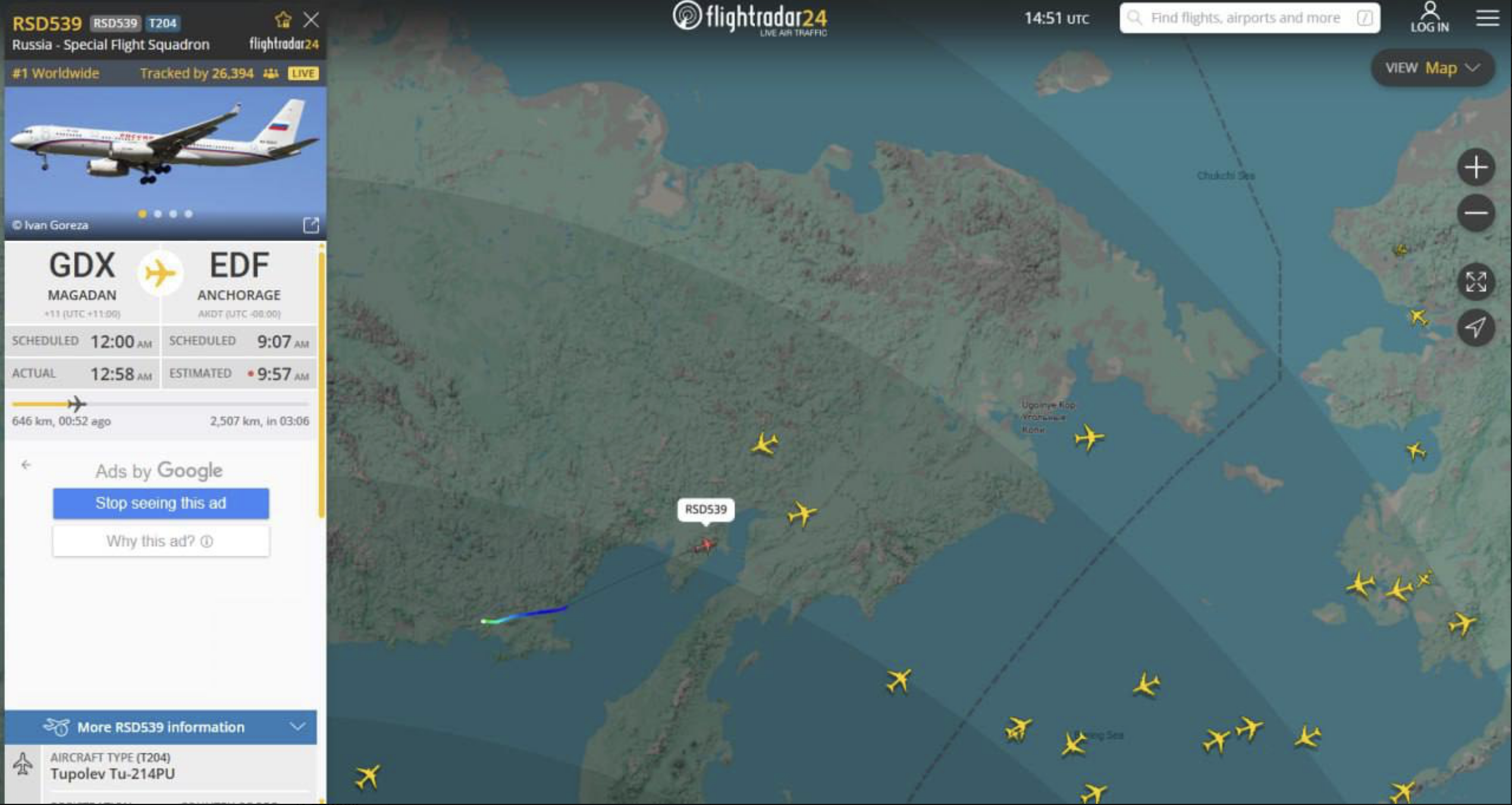 20:20 Літак Путіна заходить на посадку в Анкориджі на Алясці.