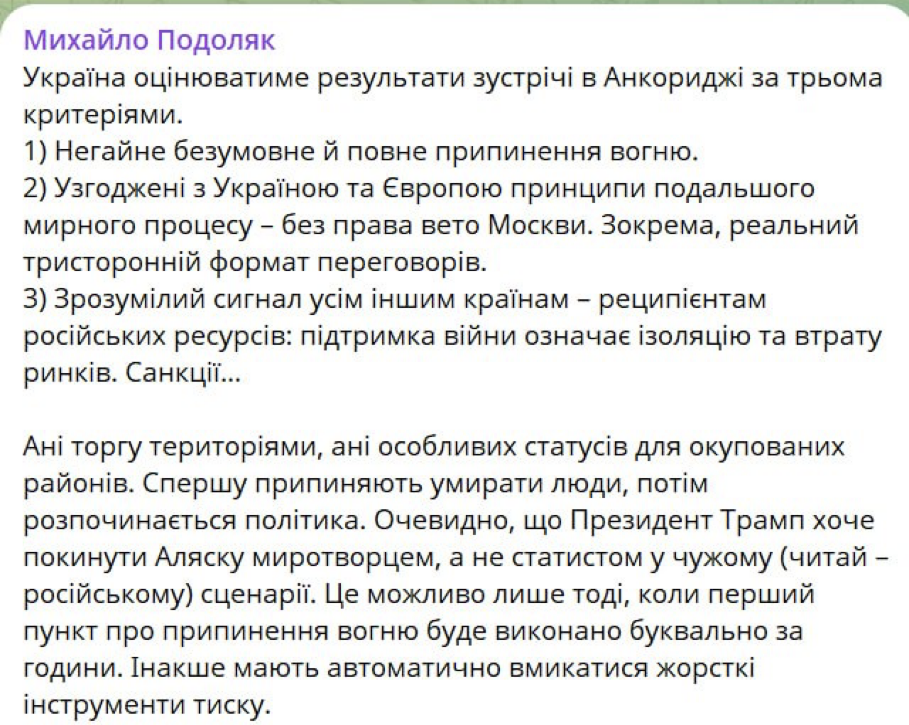 На думку Подоляка, якщо за годину після зустрічі не буде виконано перший пункт, то Трамп має включити "жорсткі інструменти тиску".