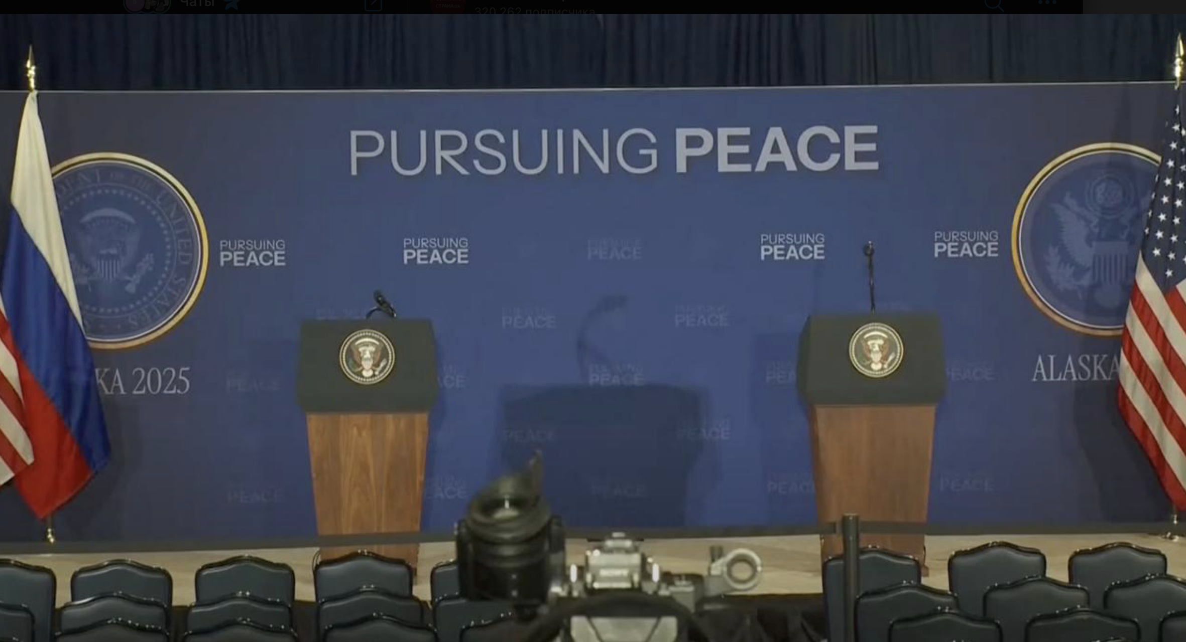 22:49 "У прагненні миру". Напис у конференц-залі, де після переговорів передбачається виступ Путіна та Трампа.