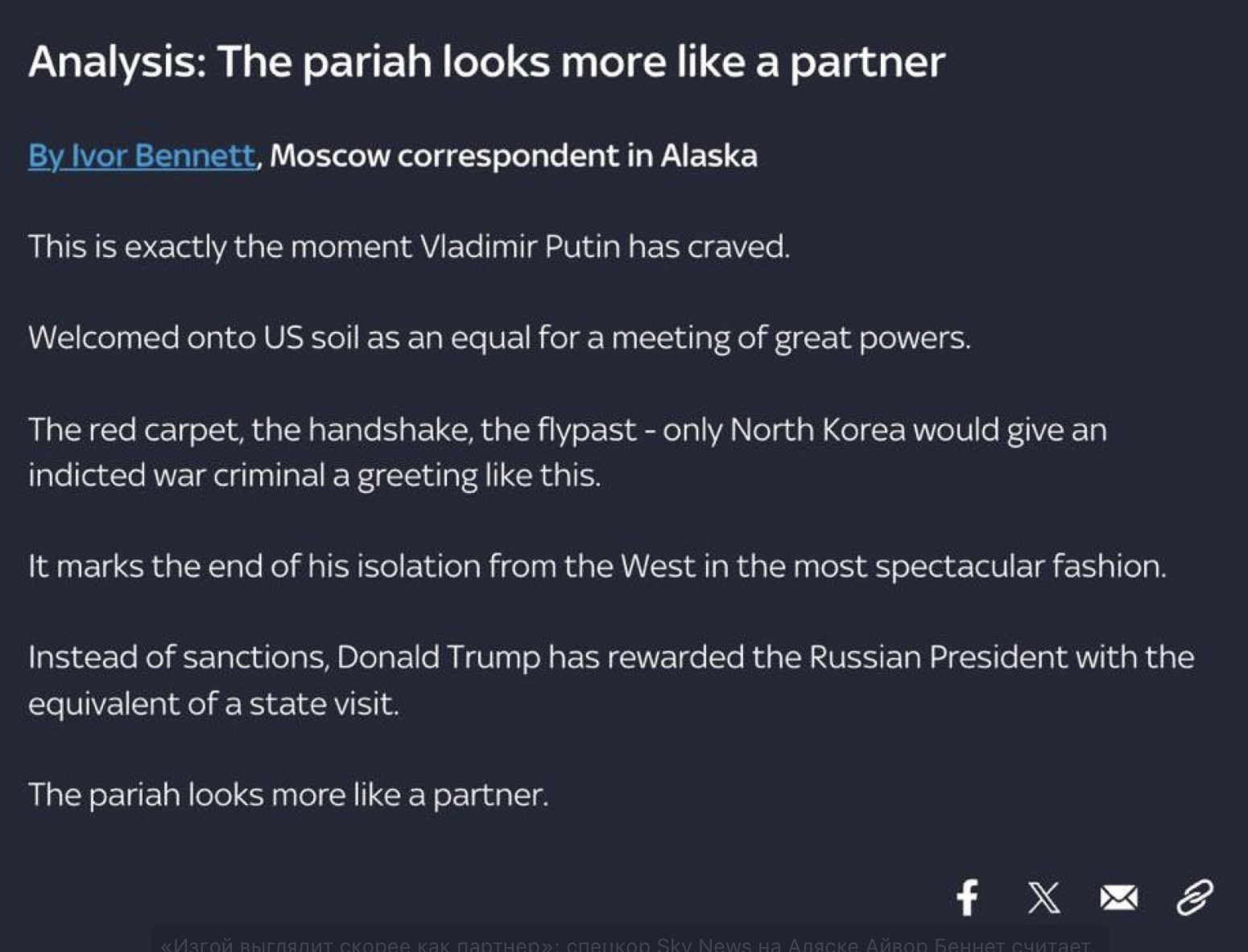 23:43 "Ізгою виглядає швидше як партнер": спецкор Sky News на Алясці Айвор Беннет вважає, що зустріч Трампа з Путіним знаменує кінець міжнародної ізоляції президента РФ.