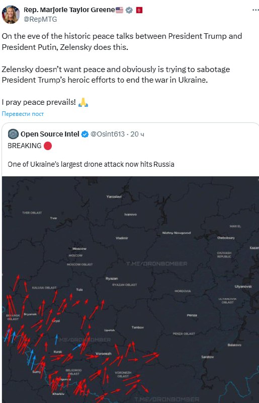 Член американської палати представників та Республіканської партії Марджорі Тейлор Грін звинуватила Володимира Зеленського в ударах по Росії з використанням безпілотників для саботажу переговорів Дональда Трампа та Володимира Путіна на Алясці.