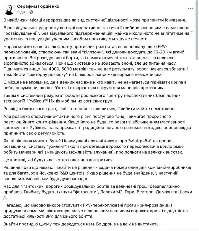 "Поки що системно не збивають уночі, але це питання часу. Підніматися вище (на 4000, 5000 метрів) теж не дає результату, ворог навчився збивати і там. Вести секторну розвідку на більшості напрямків поки що неможливо", - написав Гордієнко.