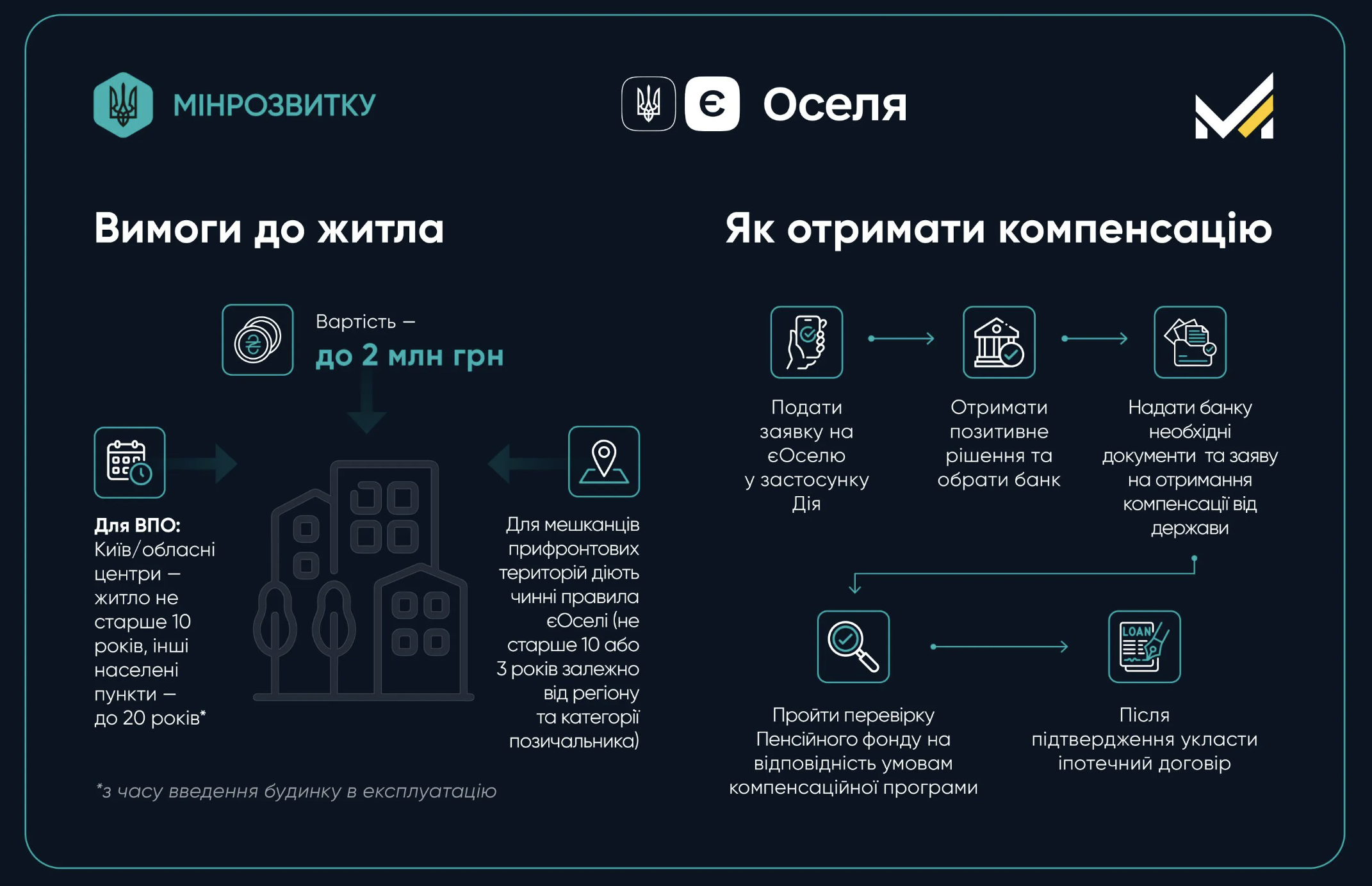 Таким людям буде надано компенсацію: до 70% від суми першого внеску, але не більше ніж 30% вартості житла, до 70% щомісячного платежу протягом першого року та до 40 тисяч гривень на супутні витрати, включаючи страховку.