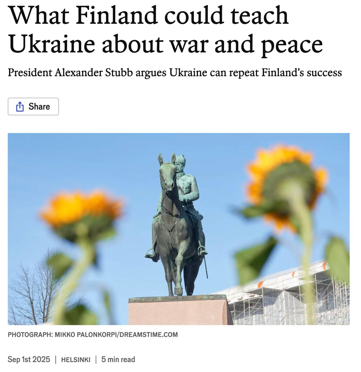 Видання нагадує заяву президента Фінляндії Олександра Стубба на нещодавній зустрічі з президентом США Дональдом Трампом у Білому домі, що "ми знайшли рішення у 1944 році, і я впевнений, що ми зможемо знайти рішення у 2025 році, щоб покласти край агресивній війні Росії, знайти і досягти міцного та справедливого миру".