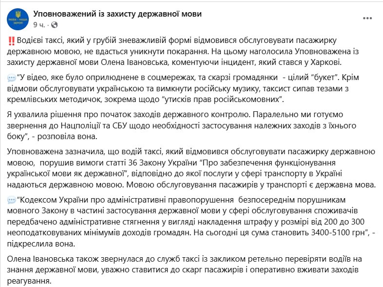 При цьому омбудсмен також звернулася до служб таксі із закликом ретельно перевіряти водіїв на знання державної мови, уважно ставитись до скарг пасажирів та оперативно вживати заходів реагування.
