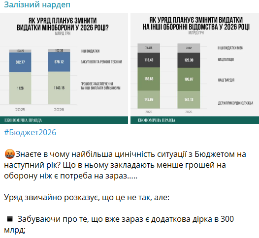 На грошове забезпечення та інші виплати військовим у бюджеті 2026 року передбачено 1,143 трлн. грн., що всього на 17,15 млрд. більше, ніж у 2025 році, де вже є дірка в сотні мільярдів.