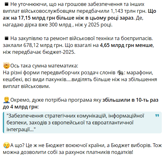 Желєзняк також звернув увагу, що на різні соціальні програми та передвиборчі ініціативи планують витратити більше, ніж на збільшення виплат військовим. А витрати на "стратегічні комунікації, інформаційну безпеку та заходи щодо євроінтеграції" збільшено вдесятеро - до 4 млрд грн.