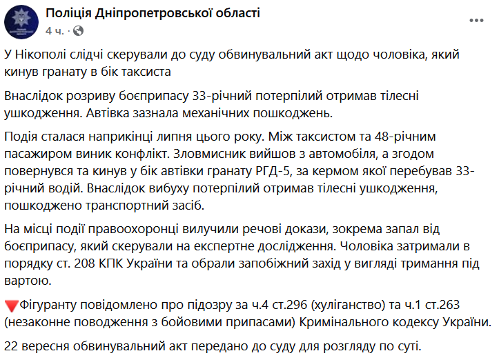 За інформацією правоохоронців, інцидент трапився наприкінці липня цього року. Між таксистом та 48-річним пасажиром виник конфлікт. Зловмисник вийшов із автомобіля, а потім повернувся та кинув у бік автомобіля гранату РГД-5. Внаслідок вибуху потерпілий отримав тілесні ушкодження, пошкоджено транспортний засіб.