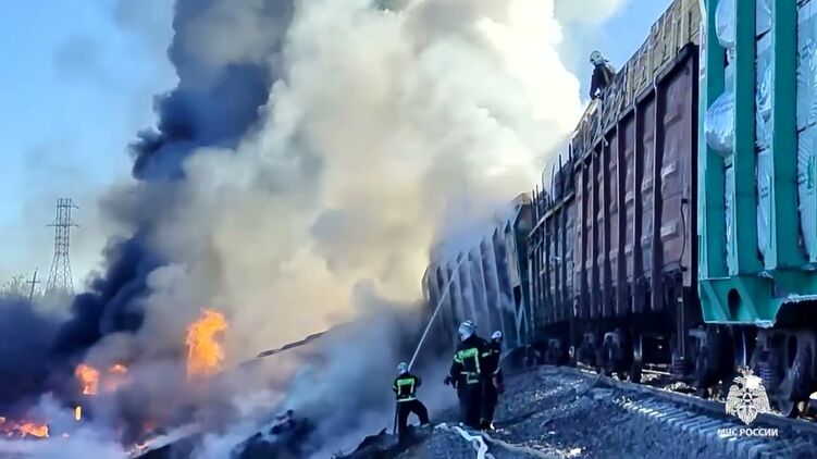 А в Смоленській області о 7:26 вантажний потяг із бензином зіткнувся з великовантажним транспортом, через що почалася масштабна пожежа, повідомляє МНС.