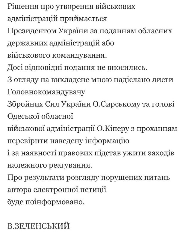 Зеленськи у своїй відповіді заявив, що подібні рішення приймаються з подання обласної адміністрації.