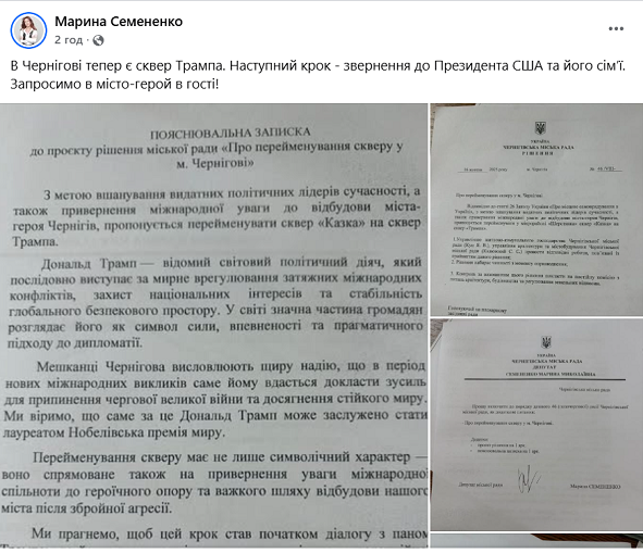 "З метою вшанування визначних політичних лідерів сучасності, а також залучення міжнародної уваги до відновлення міста-героя Чернігів пропонується перейменувати сквер "Казка" на сквер Трампа.