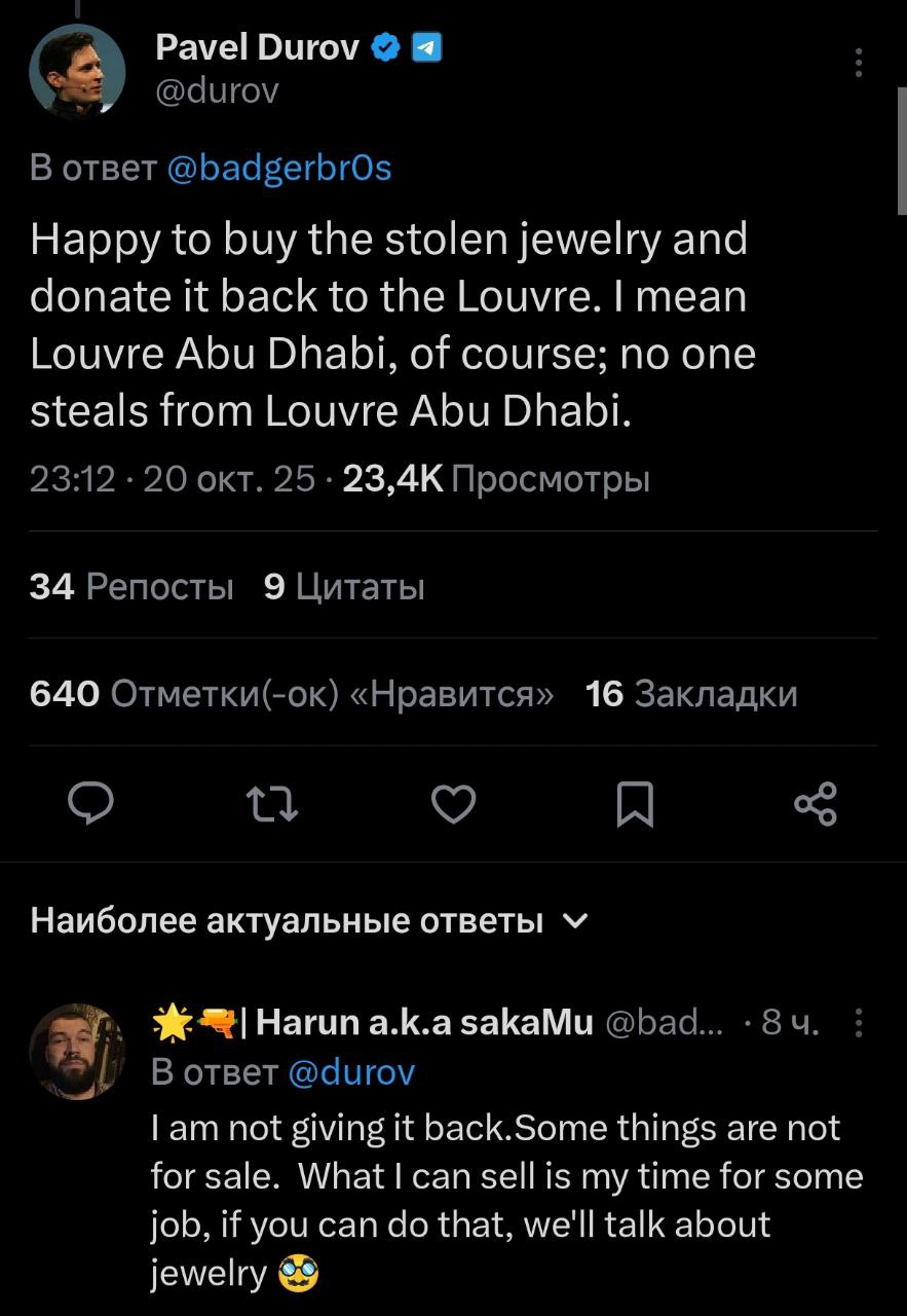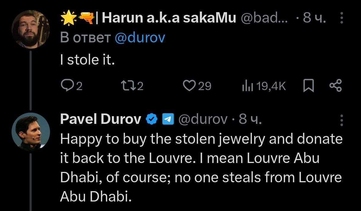 "Радий купити вкрадені прикраси і пожертвувати їх назад Лувру. Я маю на увазі, звичайно, Лувр в Абу-Дабі; адже ніхто не краде з Лувру в Абу-Дабі", - написав Дуров.