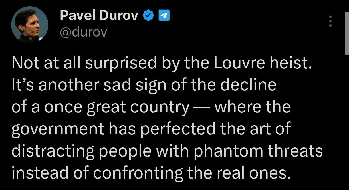 "Мене зовсім не здивувало пограбування Лувру. Це ще одна сумна ознака занепаду колись великої країни, де уряд довело до досконалості мистецтво відволікати людей уявними погрозами замість того, щоб протистояти реальним", - написав засновник Telegram.