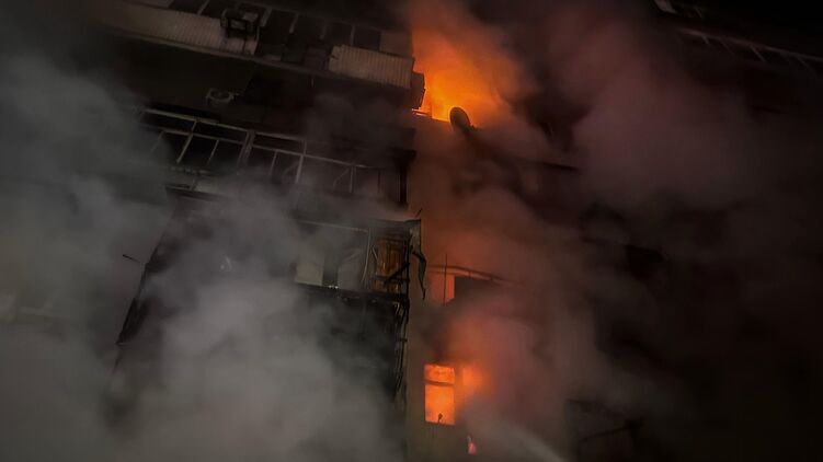 За словами мера столиці Віталія Кличка, у Деснянському районі Києва сталося потрапляння "Шахеда" до дев'ятиповерхового житлового будинку на рівні другого-третього поверхів. Там виникла пожежа після влучення, рятувальники евакуювали 13 людей із верхніх поверхів.