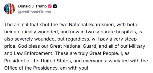 "Тварина, яка поранила двох нацгвардійців, заплатить дуже високу ціну", – прокоментував інцидент президент США Дональд Трамп.