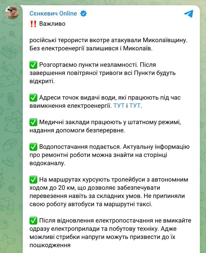 Миколаїв залишиться без електроенергії після російських атак, пише мер Олександр Сенкевич. У місті розгортають пункти незламності.