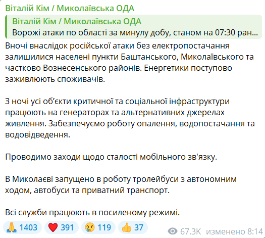 Голова Миколаївської ОДА Віталій Кім повідомив, що у Миколаєві після нічних ударів по області виникли проблеми з мобільним зв'язком та електротранспортом. На вулиці вийшли тролейбуси із автономним ходом.