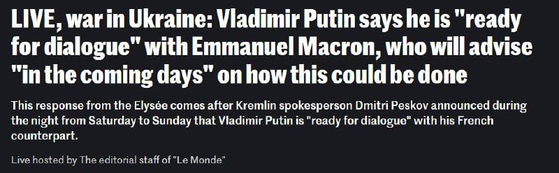 "Французька адміністрація президента вважала за "вітальну" пропозицію президента Росії Володимира Путіна "готуватися" до переговорів зі своїм колегою Еммануелем Макроном, додавши, що вона повідомить "найближчими днями", як це можна зробити.
