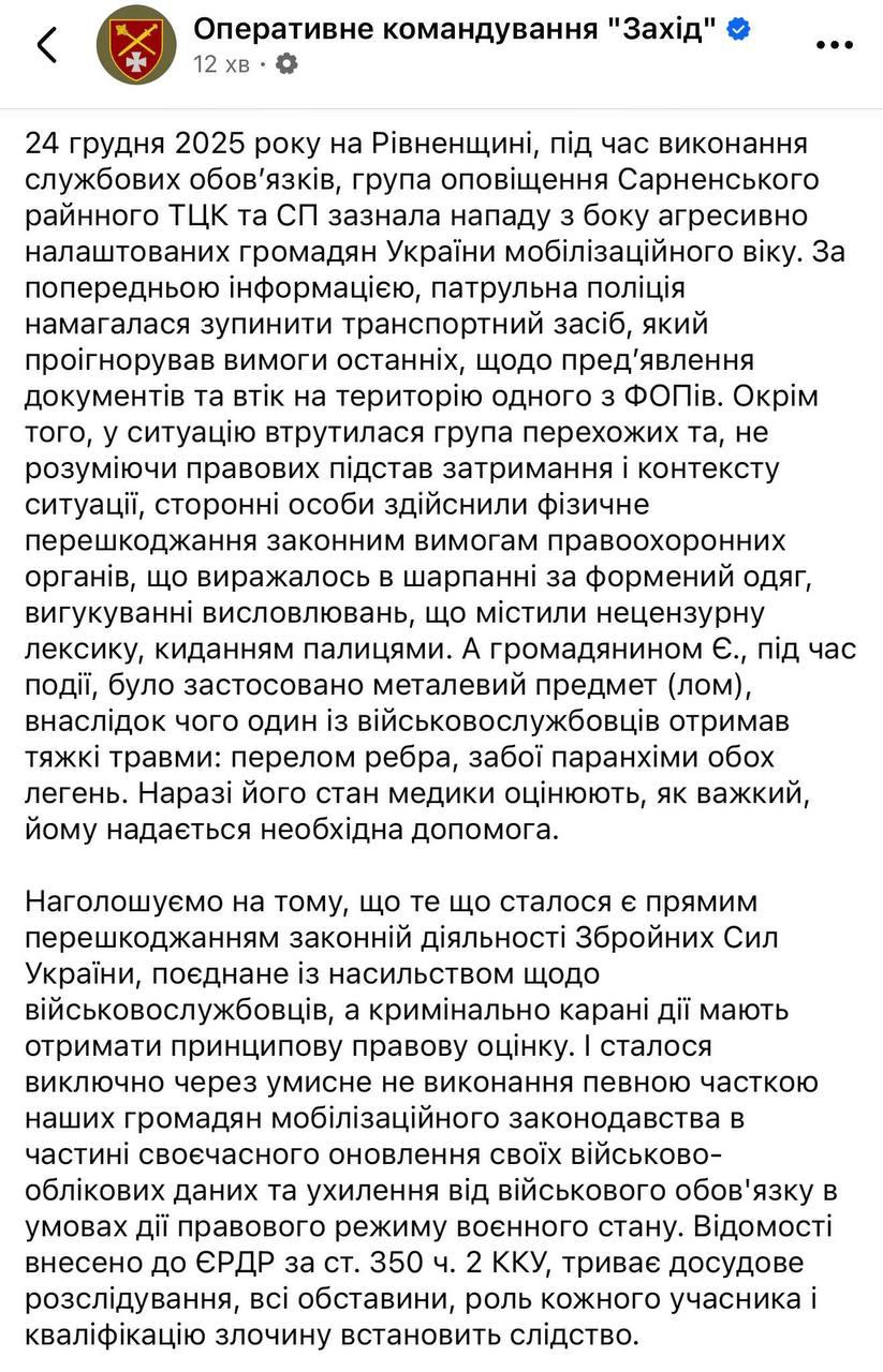 "Громадянином Є. під час події був застосований металевий предмет (брухт), внаслідок чого один із військовослужбовців отримав тяжкі травми: перелом ребра, забиття паранхіми обох легень", - йдеться у повідомленні.