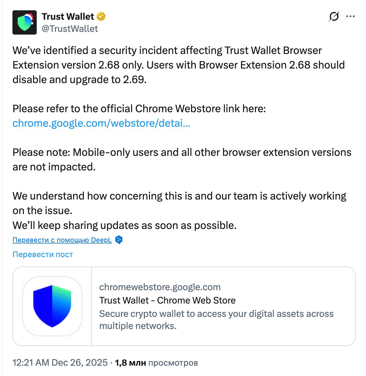"Ми локалізували інцидент безпеки. Користувачам версії 2.68 слід відключити розширення та оновитися до 2.69 для відновлення безпечної роботи", - йдеться у заяві Trust Wallet.