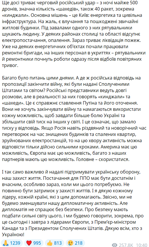 На деяких енергетичних об'єктах вже почали працювати ремонтні бригади, на інших персонал перебуває у укриттях. Ремонтні та рятувальні роботи будуть продовжені одразу після закінчення повітряних тривог, повідомив президент.
