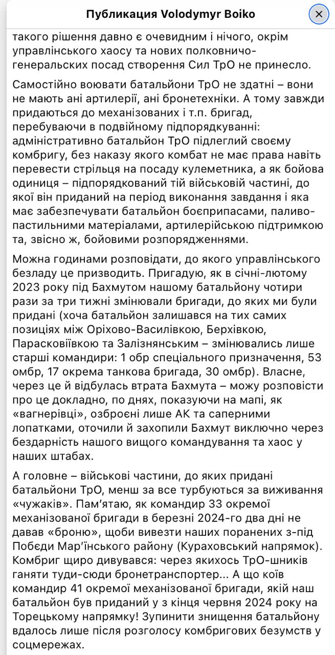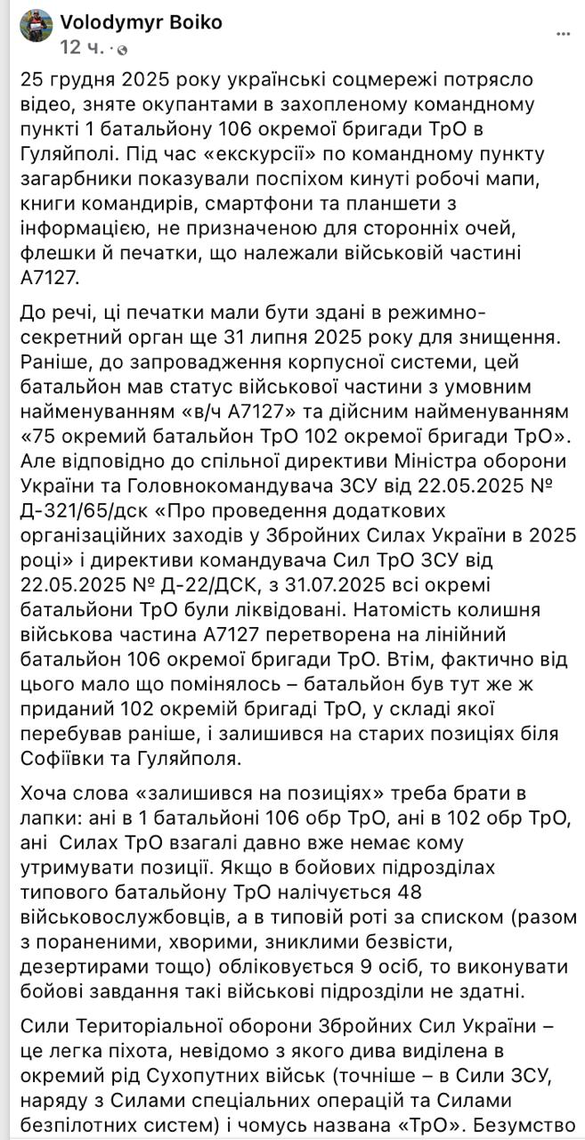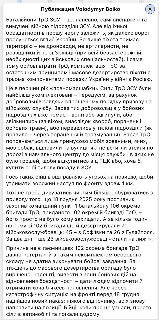 "Ні в 1-му батальйоні 106-й ОБр ТрО, ні в 102-й ОБр ТрО, ні в силах ТрО (які відповідали за цю ділянку оборони в Гуляйполі - Ред.) взагалі вже давно нікому утримувати позиції. Якщо в бойових підрозділах типового батальйону ТРО налічується 48 військовослужбовців, а в типовій роті за списком (разом з пораненими, хворими, зниклими безвісти, дезертирами тощо) числиться 9 осіб, то виконувати бойові завдання такі військові підрозділи не здатні. Батальйони ТрО ЗСУ - це, мабуть, найбільш виснажені та виснажені війною підрозділи ЗСУ. Але саме від їхньої боєздатності насамперед залежить, наскільки далеко противник просунеться вглиб України. Тому що лише піхота утримує територію... І саме тому бойові втрати ТрО, комплектування ТрО за залишковим принципом та масове дезертирство піхоти є трьома компонентами поразки України у війні з Росією", - заявляє журналіст.
