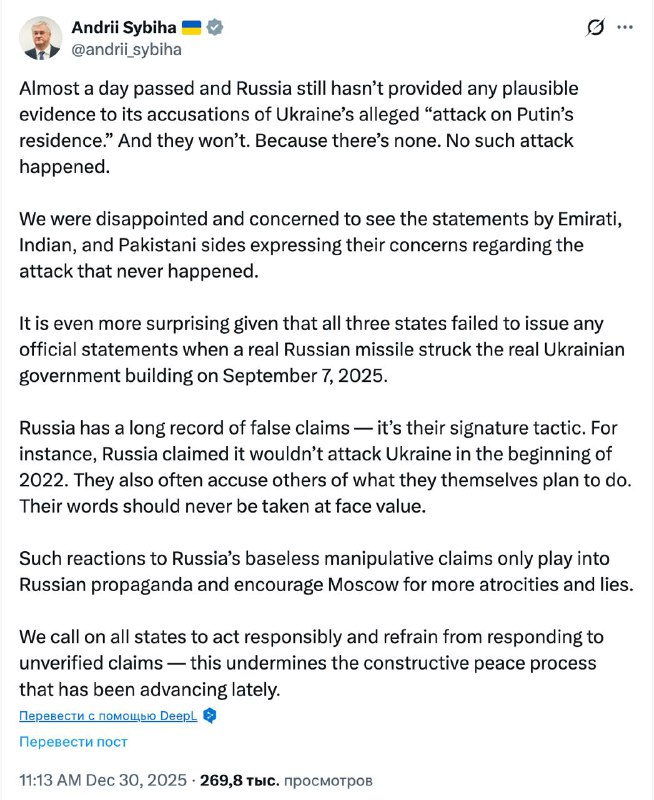 "І не надасть. Тому що їх немає. Ніякого нападу не було. Ми були розчаровані і стурбовані заявами представників ОАЕ, Індії та Пакистану, які висловили свою стурбованість з приводу нападу, якого ніколи не було. Це тим більше дивно, враховуючи, що всі три держави не виступили з офіційними заявами2, коли 2 справжній будинок українського уряду", - сказано у публікації Сибіги.
