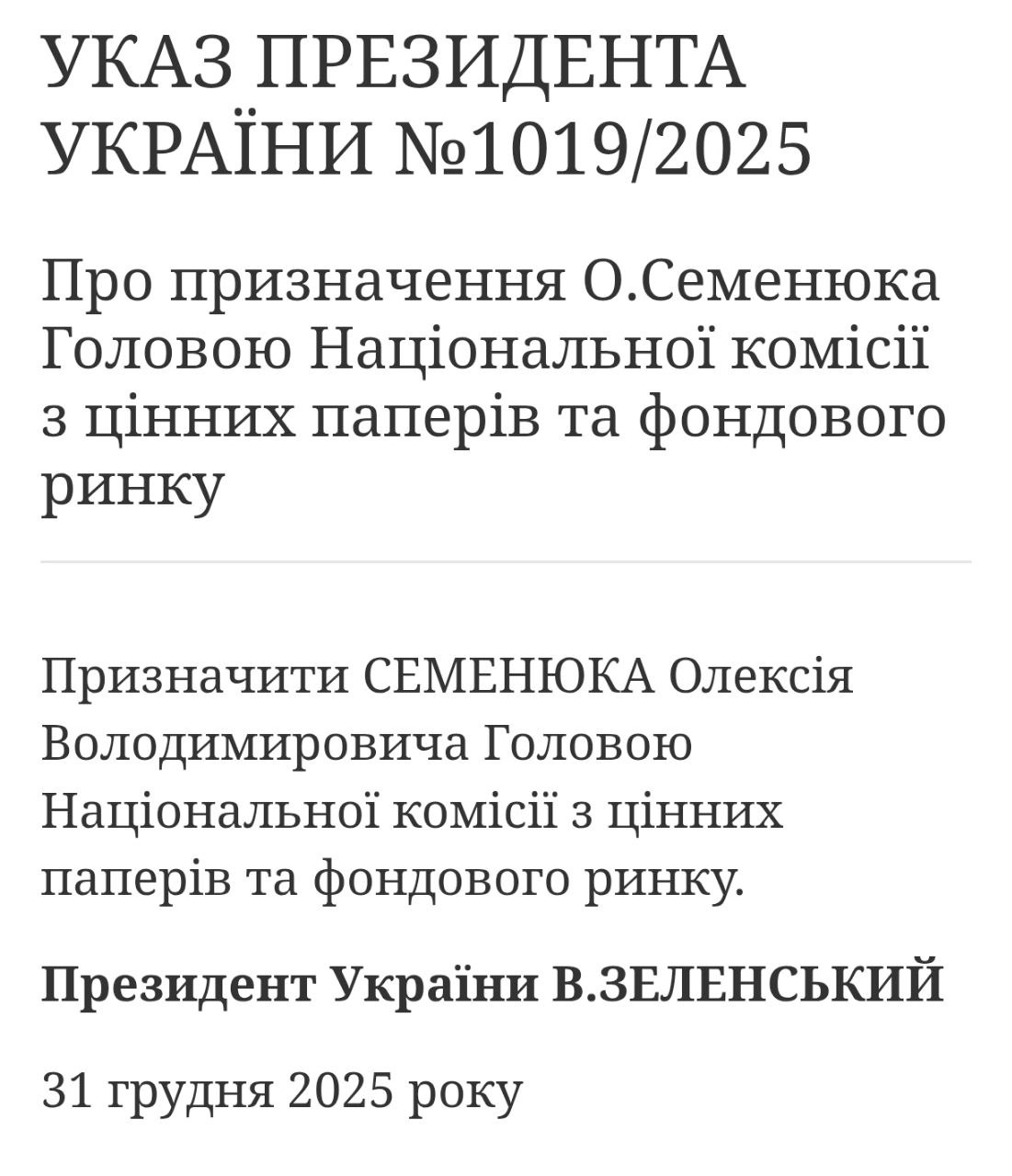 "Призначити Семенюка Олексія Володимировича головою Національної комісії з цінних паперів та фондового ринку", - йдеться у документі.