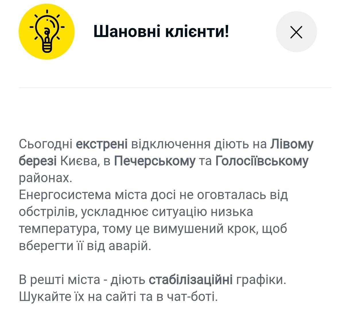 Крім того, екстрені відключення світла зараз діють на лівому березі Києва, а також у Печерському та Голосіївському районах на правому березі.