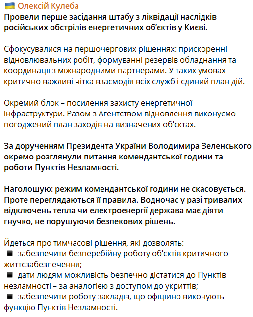 "Підкреслюю: режим комендантської години не скасовується і не переглядається. У той же час у разі тривалих відключень тепла або електроенергії держава повинна діяти гнучко, не порушуючи рішень безпеки. Йдеться про можливі тимчасові і точкові винятки, які дозволять забезпечити безперебійну роботу об'єктів критичного життєзабезпечення і безпеку. з доступом до укриття, забезпечити роботу установ, які офіційно виконують функцію пунктів незламності", - написав Кулеба.