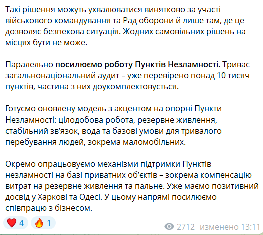 Він додав, що влада готує оновлену модель безпеки з акцентом на опорні пункти незламності, які працюватимуть цілодобово, матиме резервне харчування, стабільний зв'язок, воду та базові умови для тривалого перебування людей, у тому числі малорухливих.
