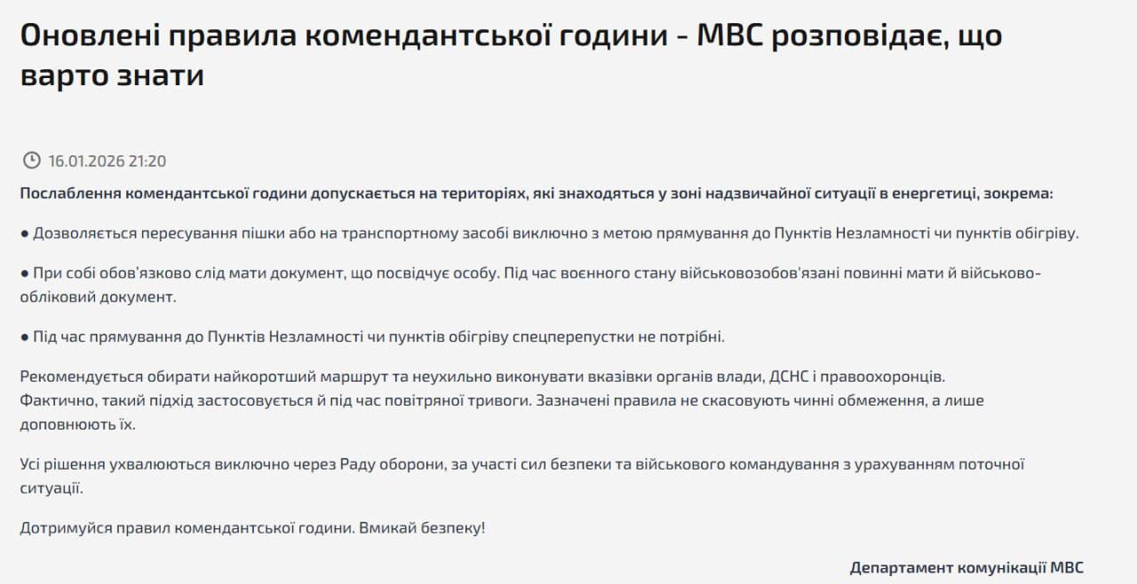 Нагадаємо, уряд дозволив у регіонах, де введено надзвичайний стан в енергетиці (включаючи Київ), пересуватися до пунктів обігріву під час комендантської години.