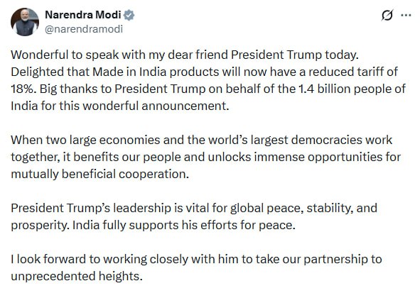 "Було чудово сьогодні поговорити з моїм дорогим другом, президентом Трампом. Я радий, що на товари, вироблені в Індії, тепер діятиме знижене мито у розмірі 18%. Велике спасибі президенту Трампу від імені 1,4 мільярда мешканців Індії за це чудове оголошення", - написав він.